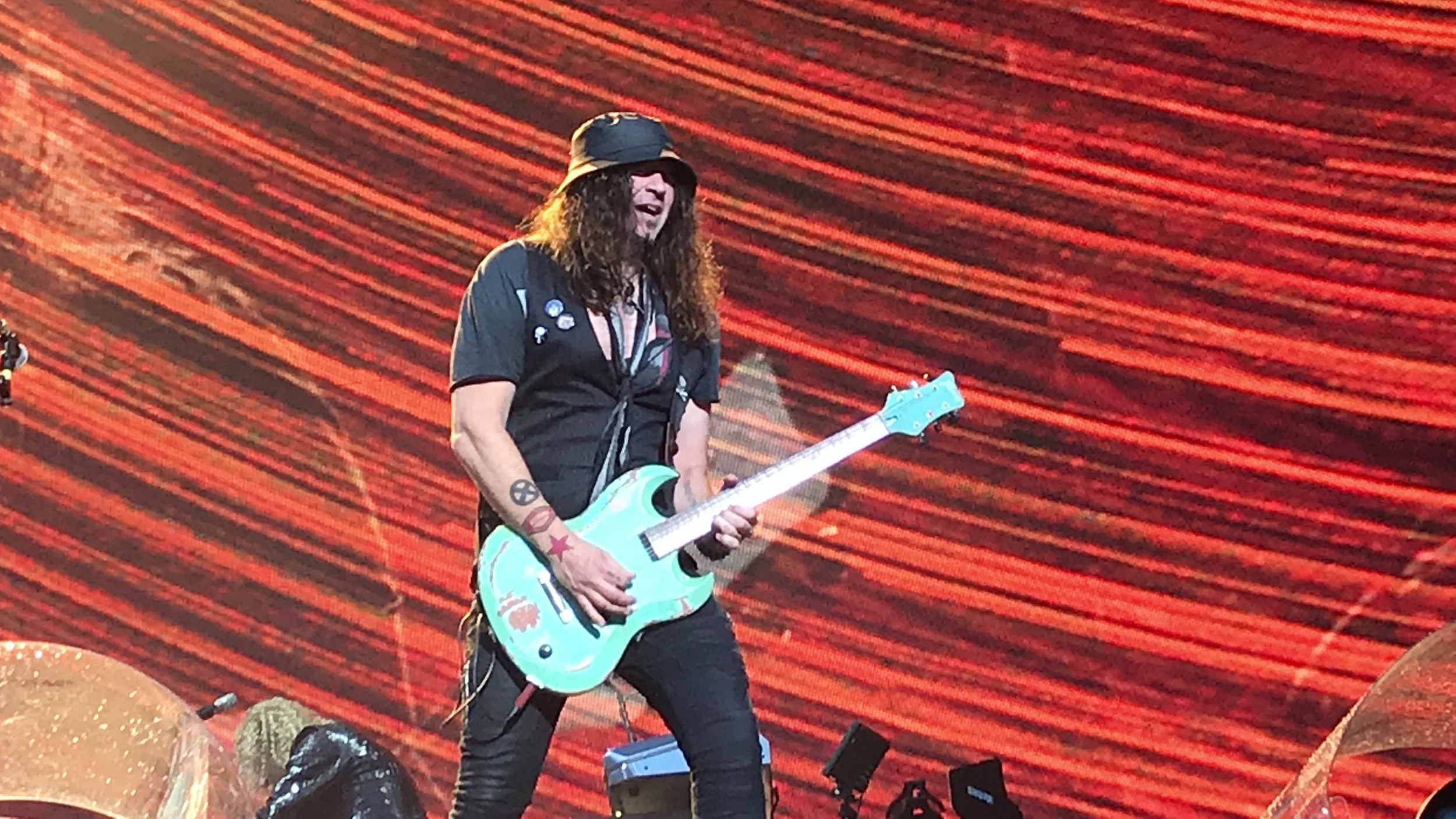 At the end of We Weren’t Born to Follow Phil X tried to change guitars and got all tangled up in his scarf. JBJ’s reaction to Phil’s struggle was hysterical. Definitely reminded me why the Incredibles don’t wear capes.